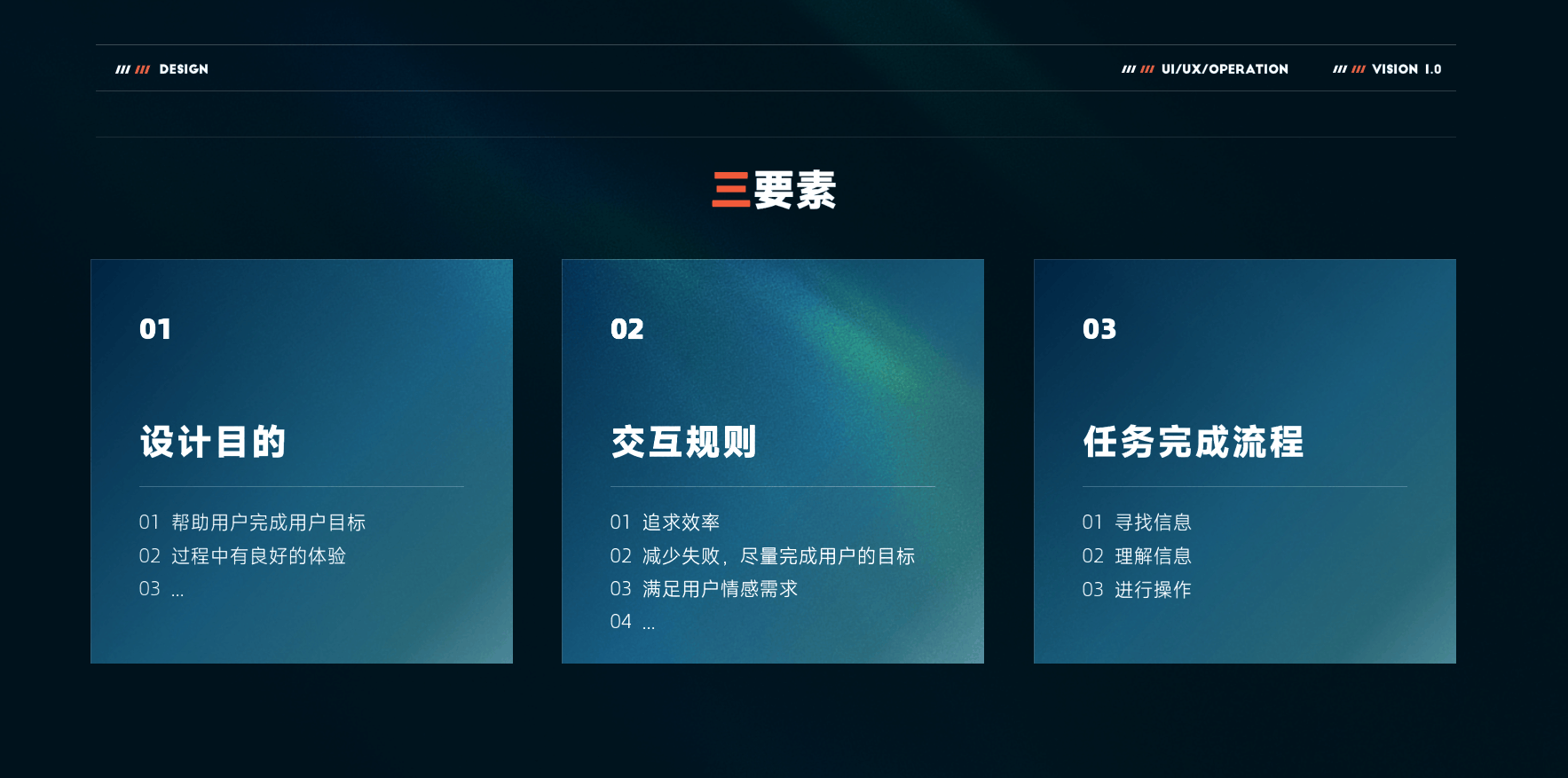 這里說(shuō)的三要素分別為 設(shè)計(jì)目的、交互規(guī)則、完成任務(wù)過(guò)程。(三要素的定義說(shuō)明都以簡(jiǎn)單化的去舉例,主要展示整體的思維方法)