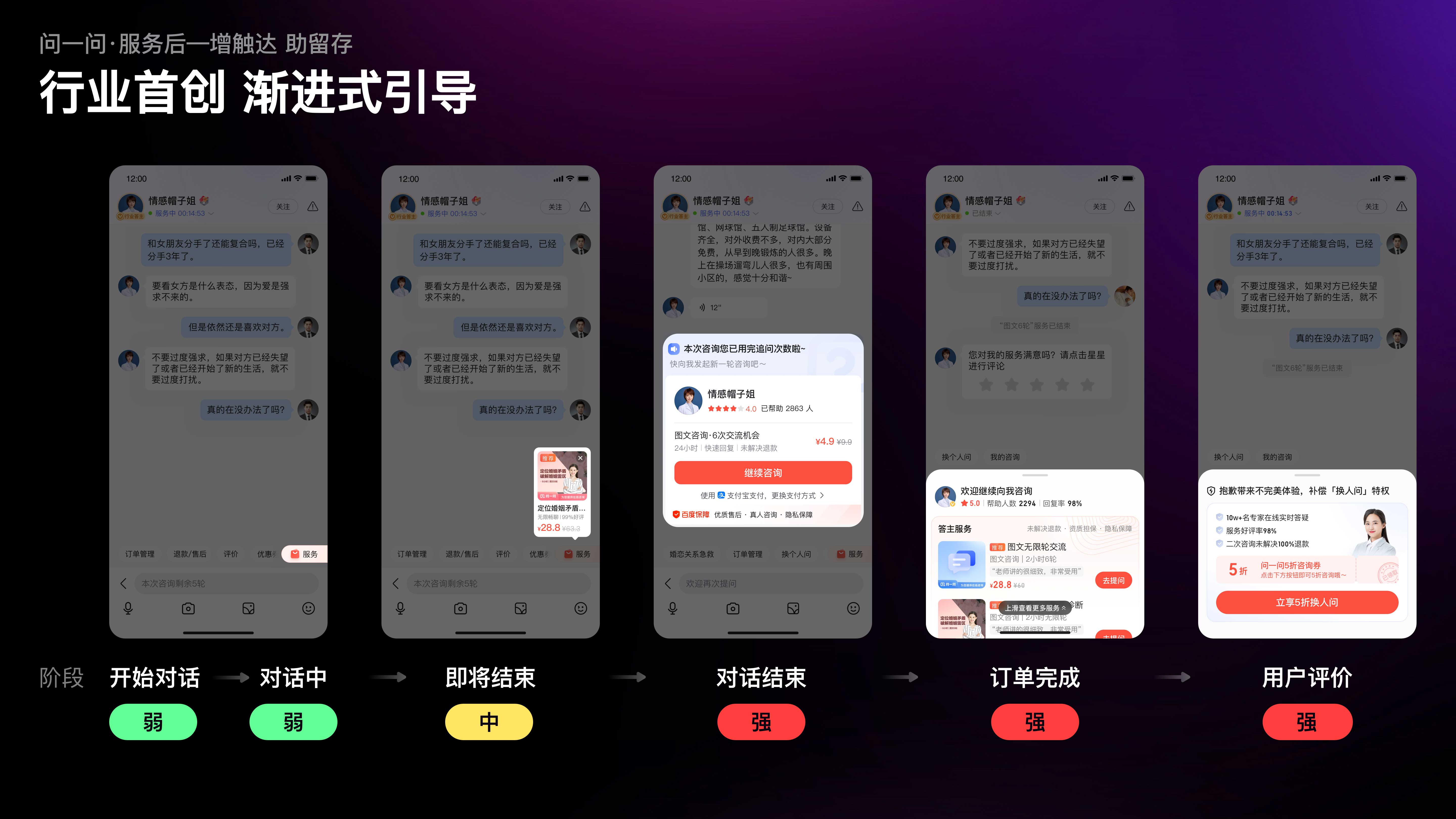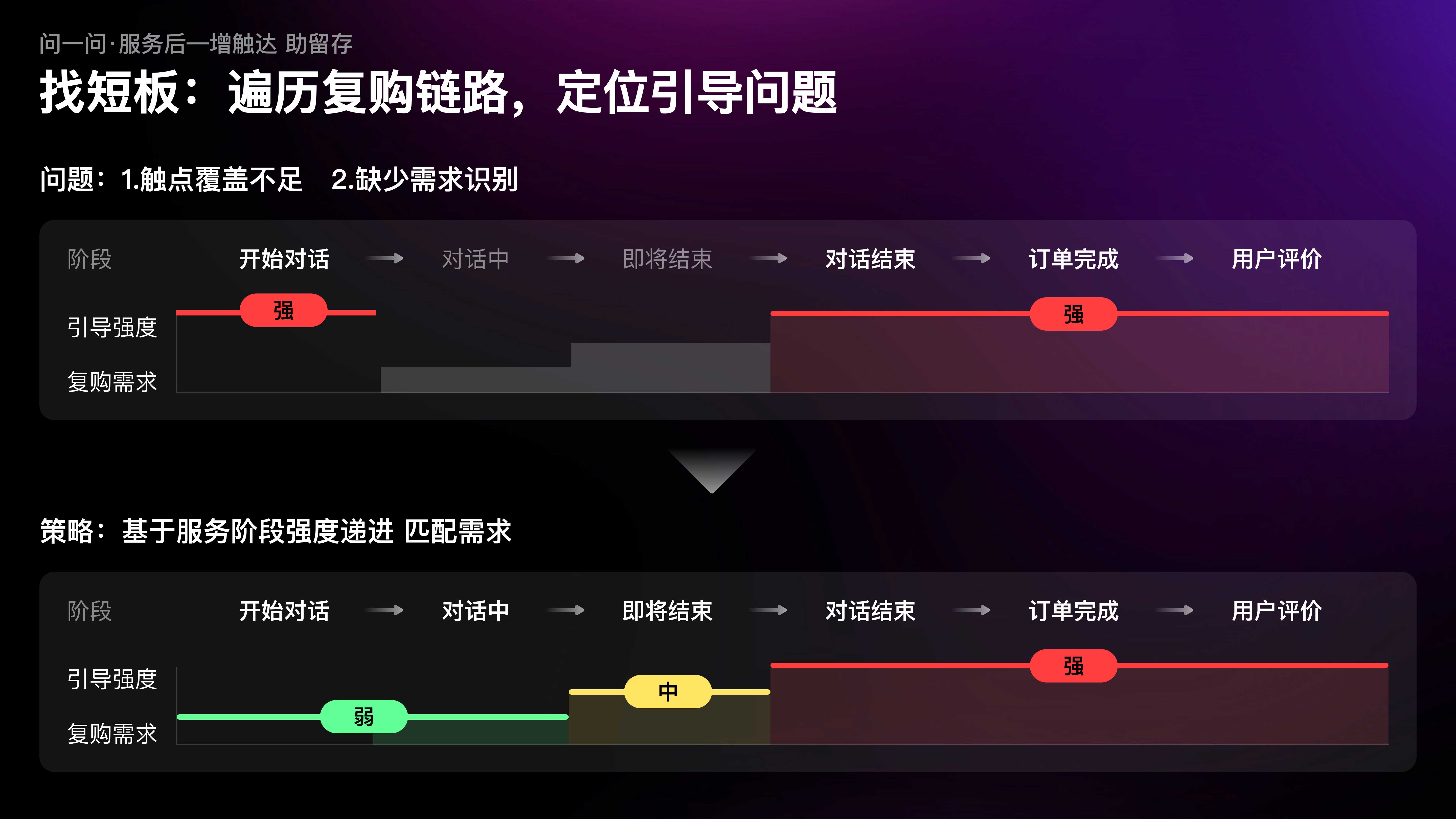 當我們以用戶視角,遍歷咨詢鏈路中的復購引導時,發現復購引導的觸點覆蓋不足,且缺少對特定場景下需求的識別,例如在咨詢開始時復購需求極弱,但設計引導極強;而在隨后的對話過程中需求漸增,但引導缺失。因此,我們制定了行業首創的漸進式引導策略;隨著服務推進,復購需求漸增,觸達強度也逐級遞進。