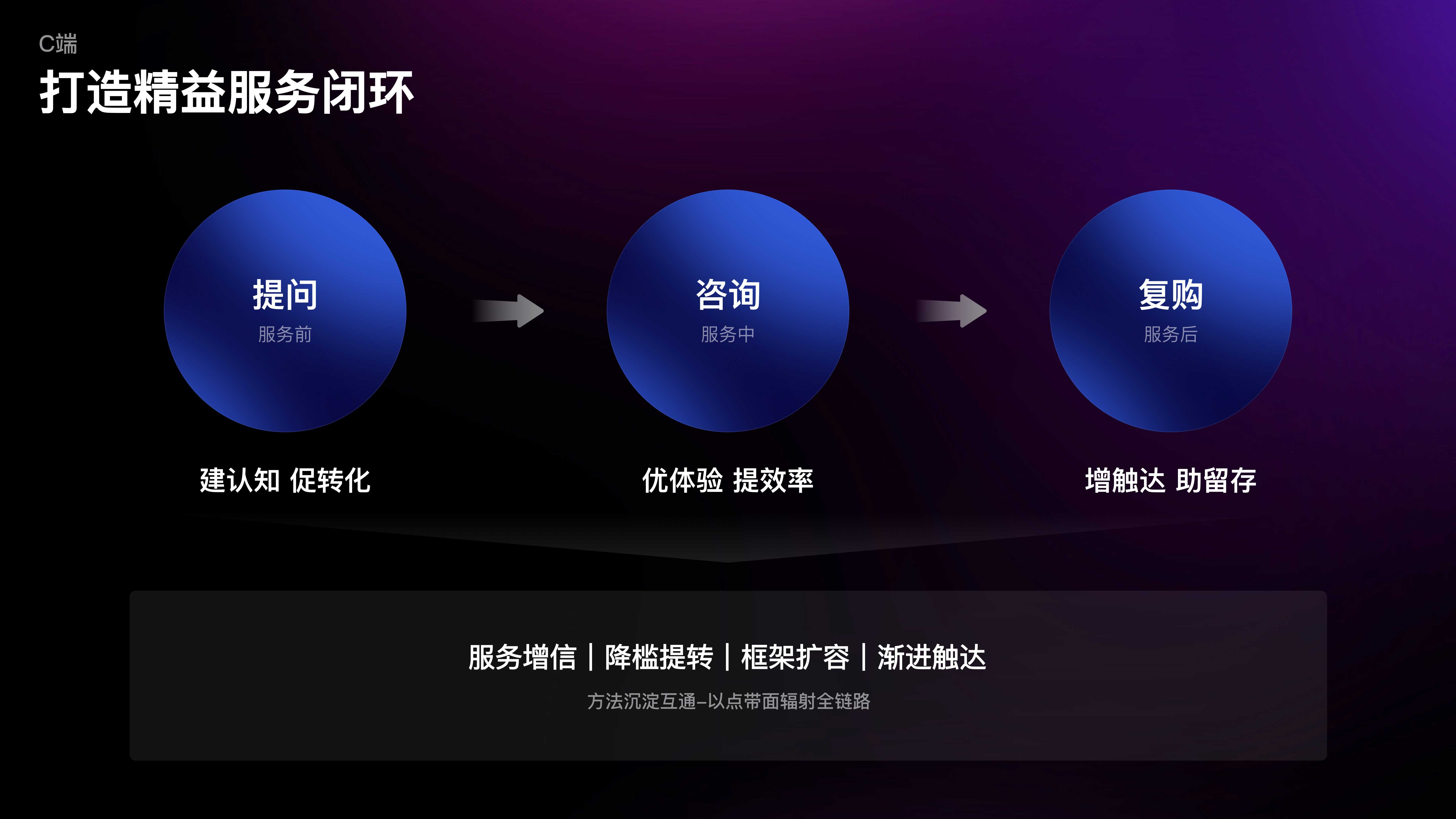 ?到了新的發展階段,我們的設計愿景該如何實現?問一問設計團隊以“服務體驗”為原點,發起了C端核心服務體驗的升級專項。借助用戶觀察、體驗遍歷等方法,沿用戶真實體驗路徑梳理服務“前-中-后”各階段的關鍵問題、挖掘優化機會。再結合設計、體驗雙視角,建立以服務前“建認知、促轉化”、服務中“優體驗、提效率”、服務后“增觸達、助留存”為核心指導原則的設計打法。通過切實滿足用戶在服務各階段需求來激發持續消費、讓服務閉環順暢運轉,從而有效地賦能業務增長,達到體驗和收入的雙豐收。