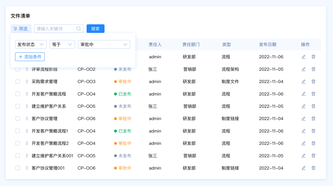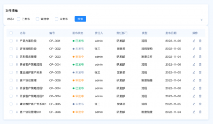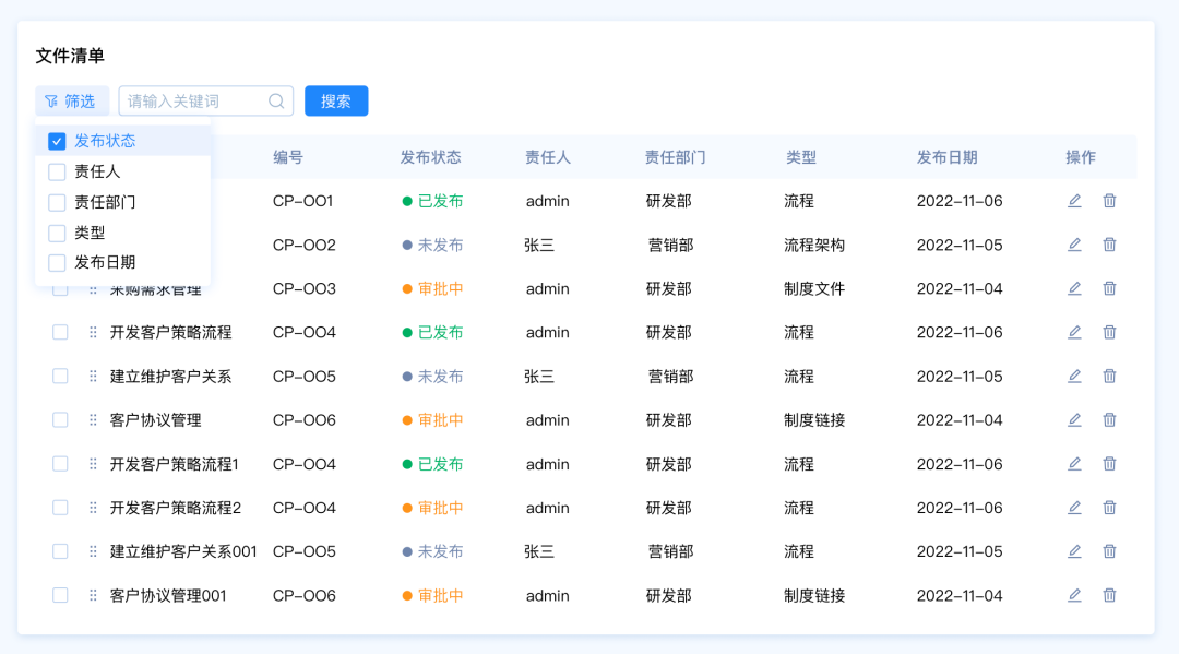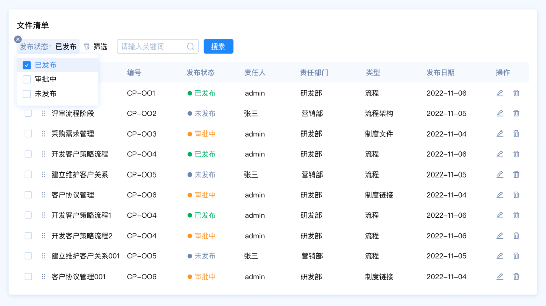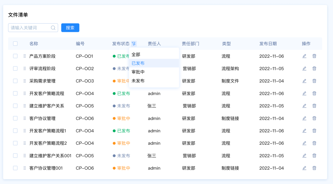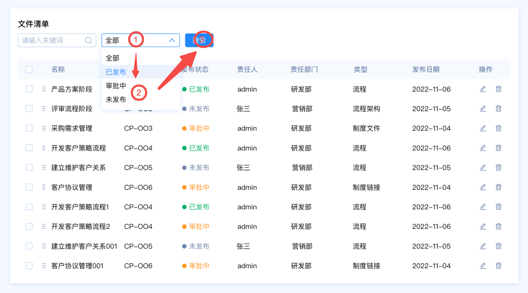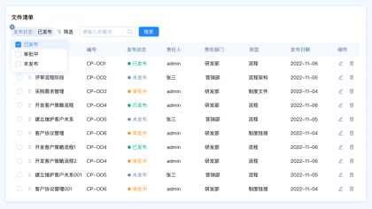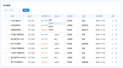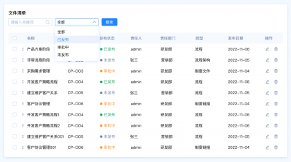 需求背景:客戶A想要快速篩選文件清單中發布狀態為“審批中”的數據,希望能夠直接看到文件的狀態類型,快速選擇類型。