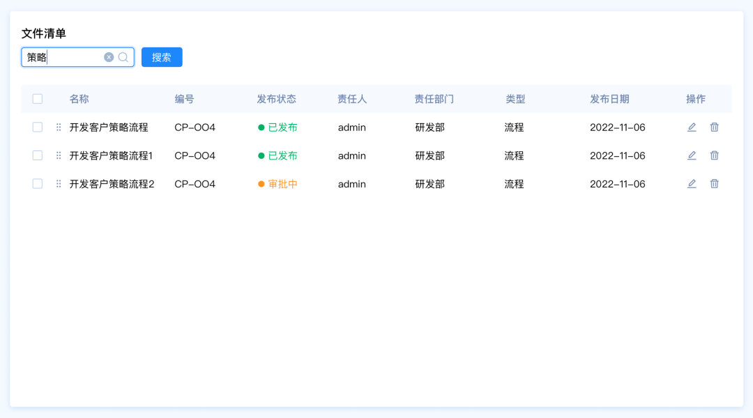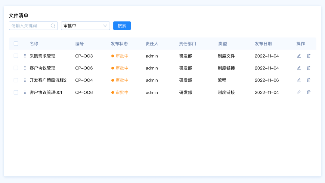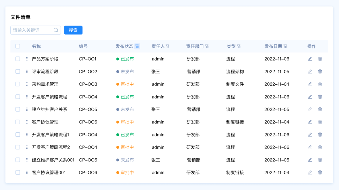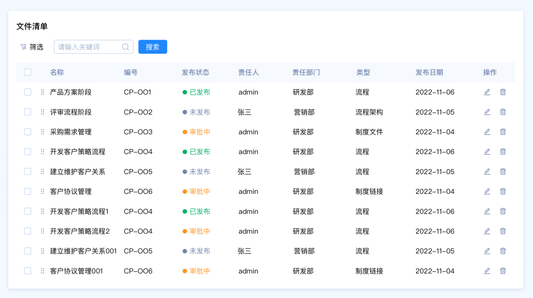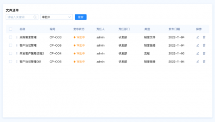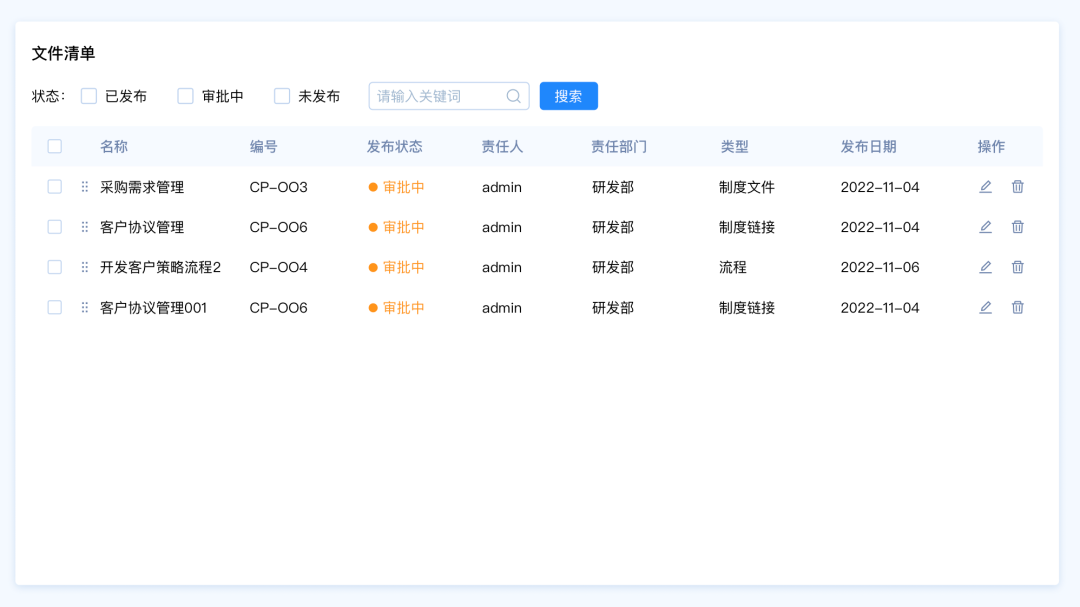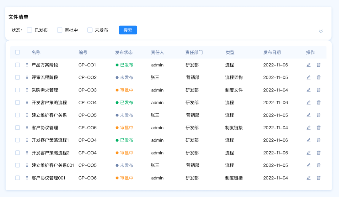 需求背景:客戶A想要快速篩選文件清單中發布狀態為“審批中”的數據,希望能夠直接看到文件的狀態類型,快速選擇類型。