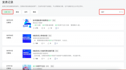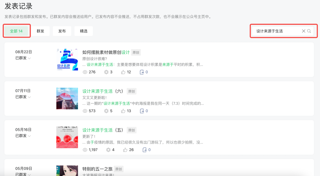 例如在微信公眾號發表記錄中的搜索,當只輸入“設計”關鍵詞時,搜索結果一共有202條,需要在這202條數據中找到自己的目標值是比較難的。