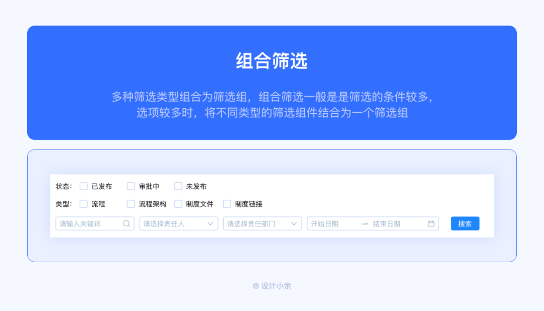 多種篩選類型組合為篩選組,組合篩選一般是是篩選的條件較多,選項較多時,將不同類型的篩選組件結合為一個篩選組。用戶在使用時,只需要將所有的條件輸入/選擇后,點擊搜索即可完成篩選,得到的結果將是多個條件組合后的并集/合集的值。