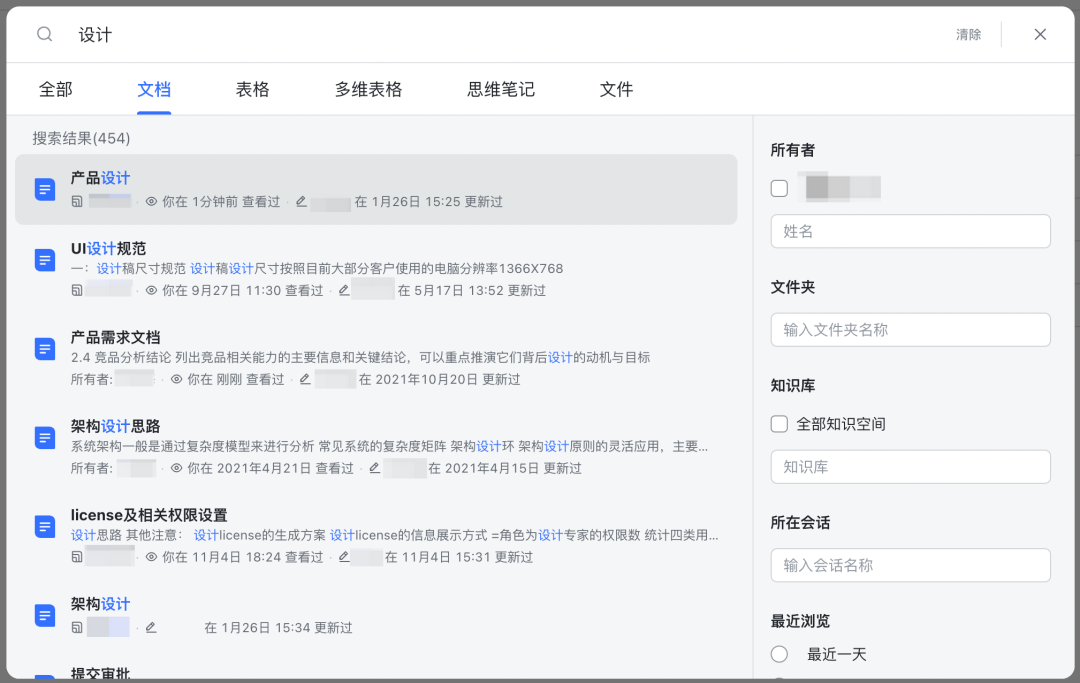 例如:在飛書文檔中,通過搜索關鍵詞后,分別展示該關鍵詞在文檔、表格、多維表格、思維筆記、文件五大類別中展示結果集,用戶通過類別區分,再縮小范圍尋找目標值。