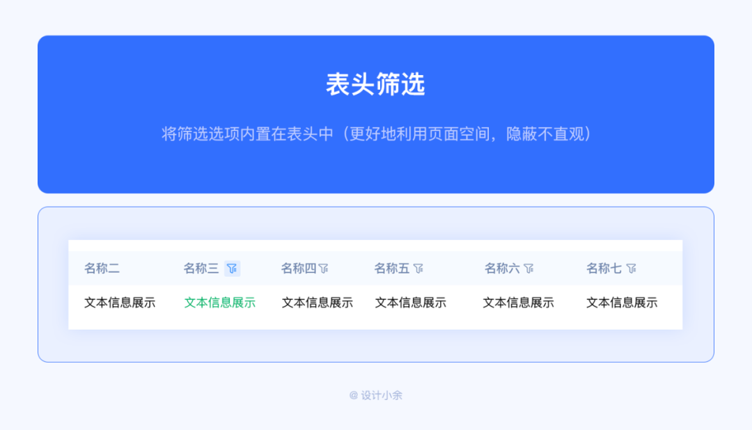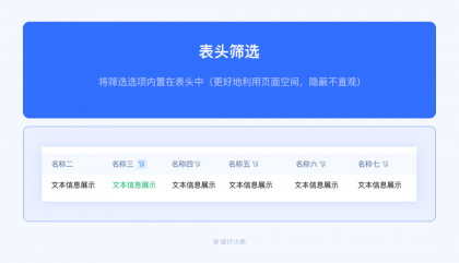 將篩選選項內置在表頭中(更好地利用頁面空間,隱蔽不直觀)。當頁面空間有限時,可以考慮此方案。另外當表格表頭字段數據較多時,需要橫向滑動查看數據時,建議還是直接將篩選條件單獨放在外面。或者當需要篩選的選項太多時,表頭字段都能篩選時,也可以考慮放在表頭中。