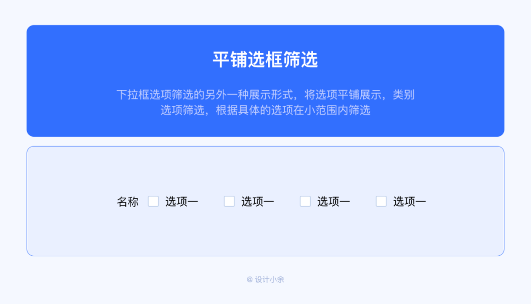 下拉框選項篩選的另外一種展示形式,將選項平鋪展示,類別選項篩選,根據具體的選項在小范圍內篩選。