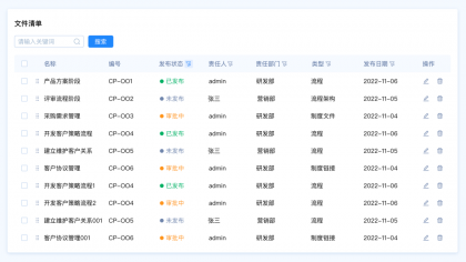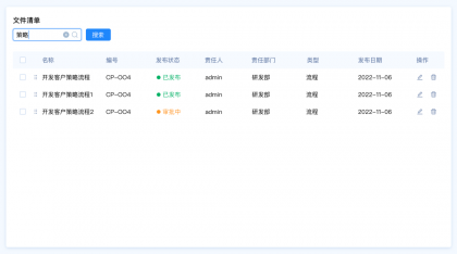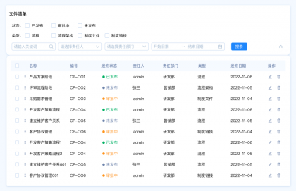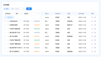 設計要點:由于這里包含多種篩選類型,名稱和編號是關鍵詞篩選,發布狀態和、責任人、責任部門、類型是選項篩選,發布日期是時間區間篩選。所以我們需要采用組合篩選的模式。