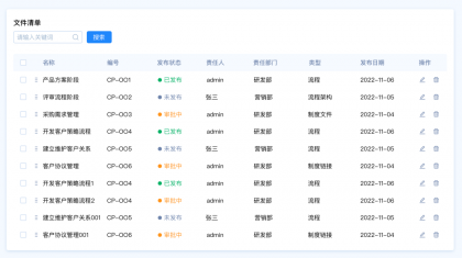設計要點:客戶需要根據文件清單的狀態快速篩選數據,文件的狀態一共分為三類:已發布、審批中、未發布,雖然客戶只說需要篩選審批中的數據,但是另外兩個狀態的數據也同樣有篩選的場景,所以我們直接將狀態類型作為選項,客戶使用時只需要選擇狀態類型即可快速完成篩選。