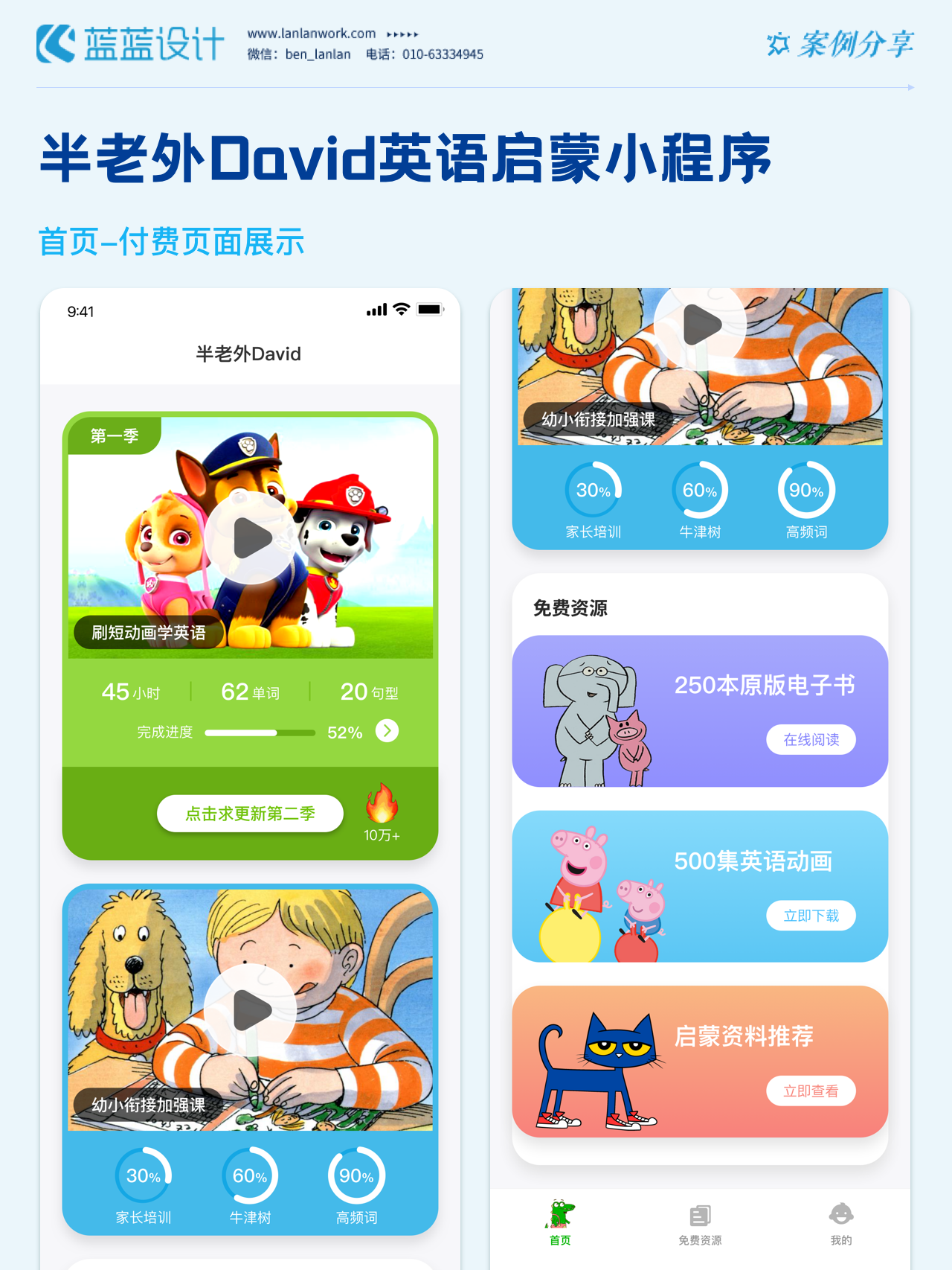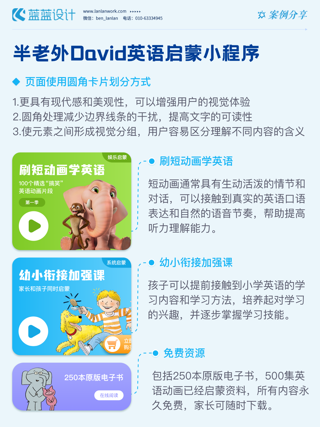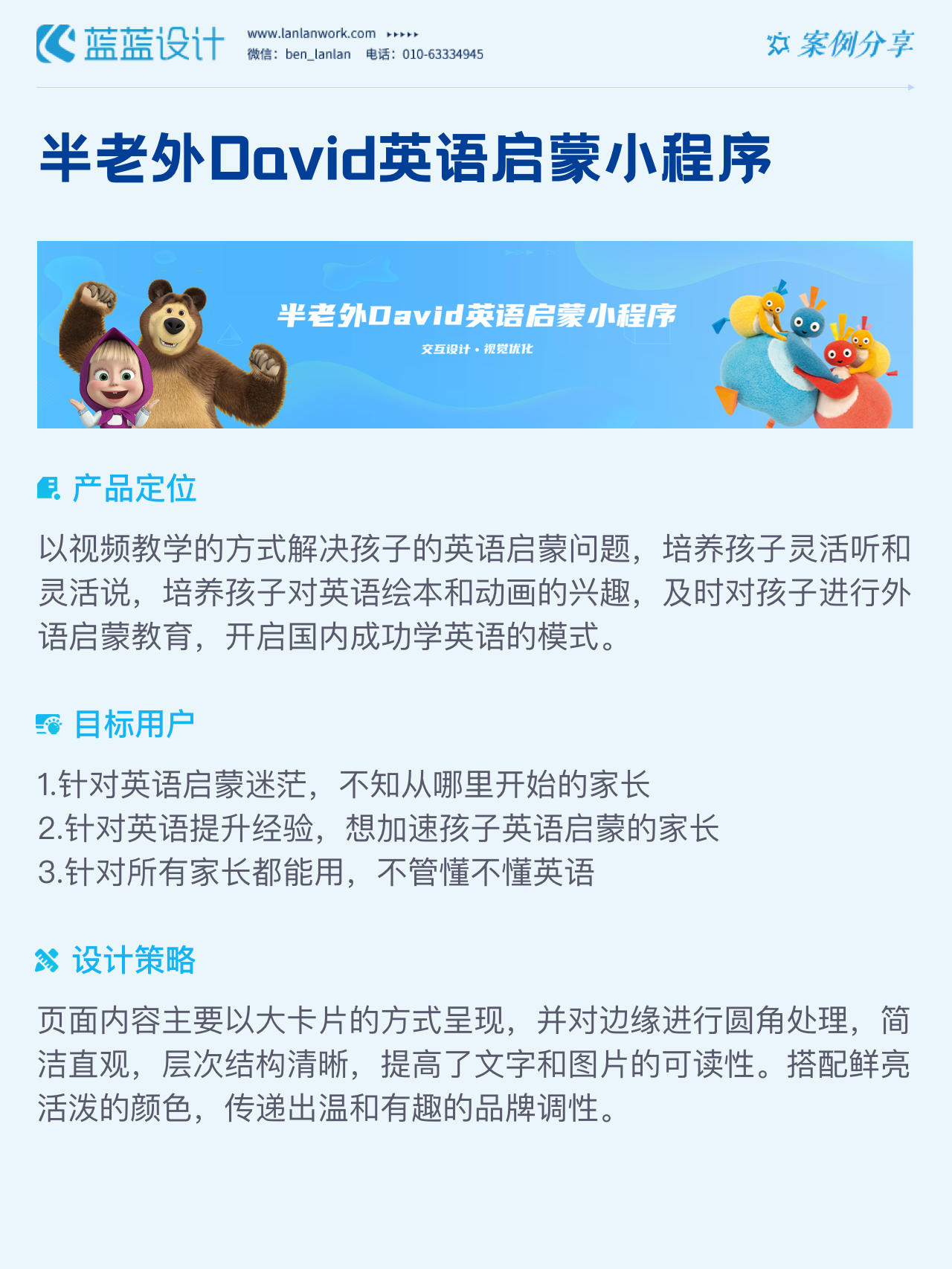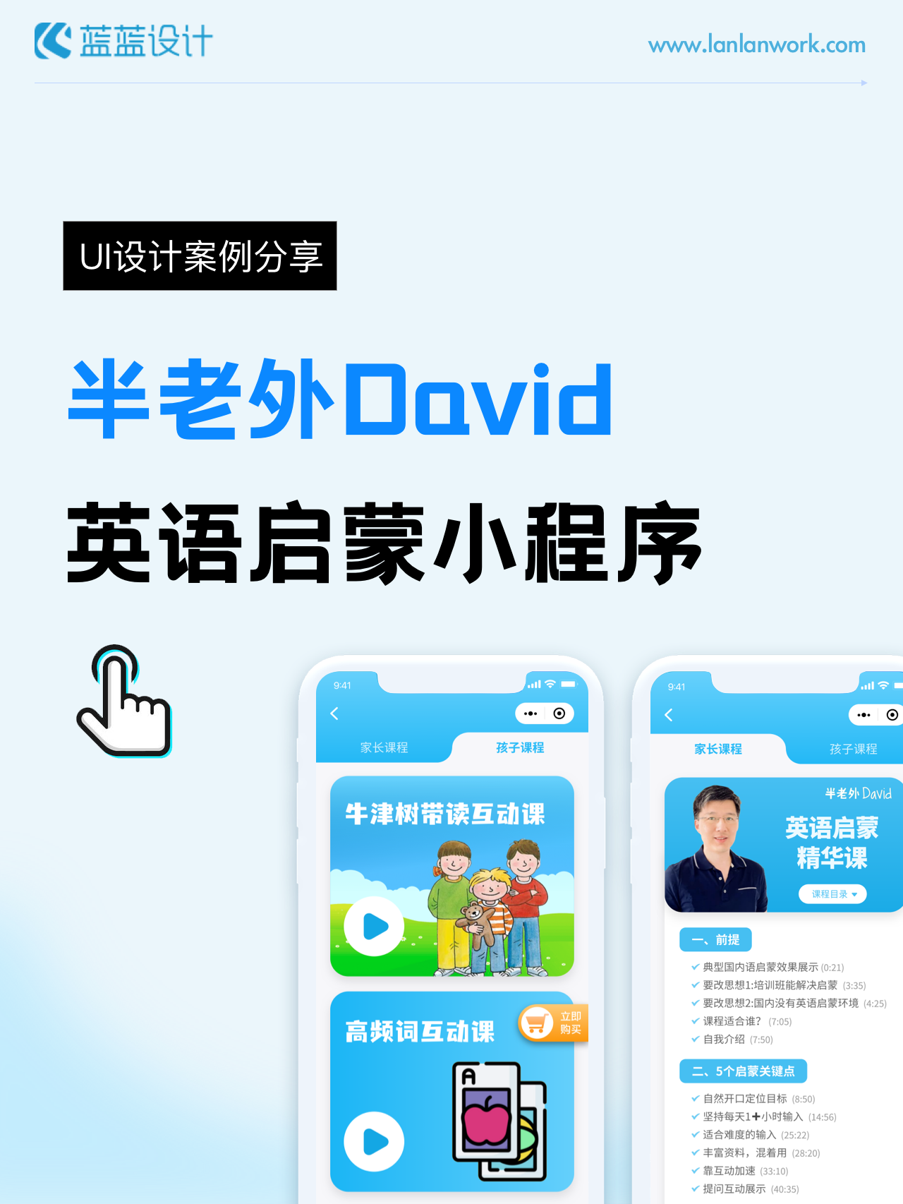 藍藍設計負責半老外David英語啟蒙小程序的界面整體風格和細節優化工作,也包括圖片優化等諸多視覺內容。前期雙方通過不斷溝通和深入了解最終確定了頁面的風格樣式。看視頻學英語的方式更容易為孩子所接受,頁面的簡潔風格和顏色應用更加吸引兒童。