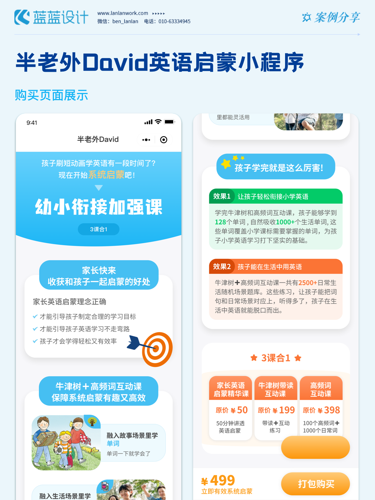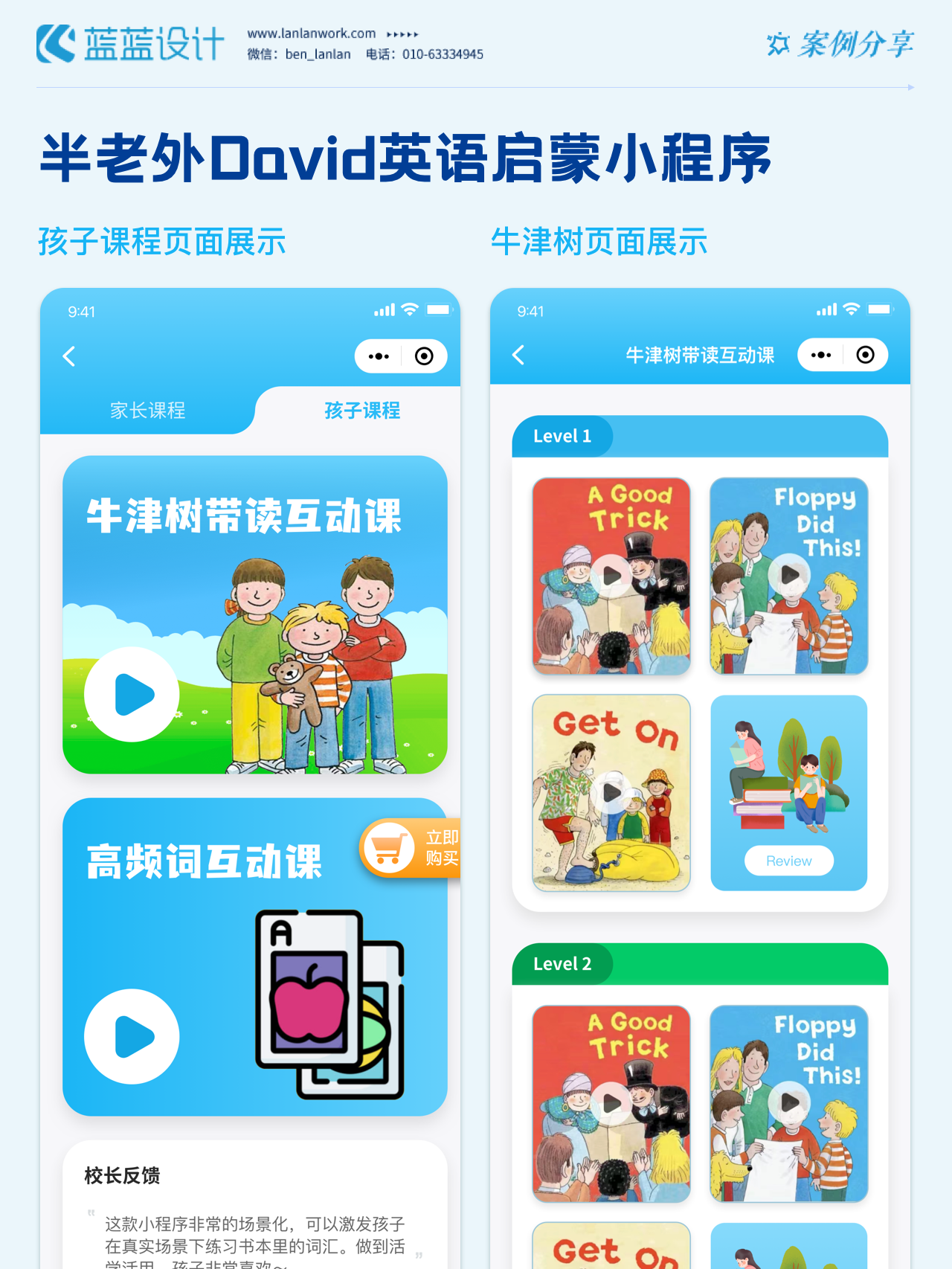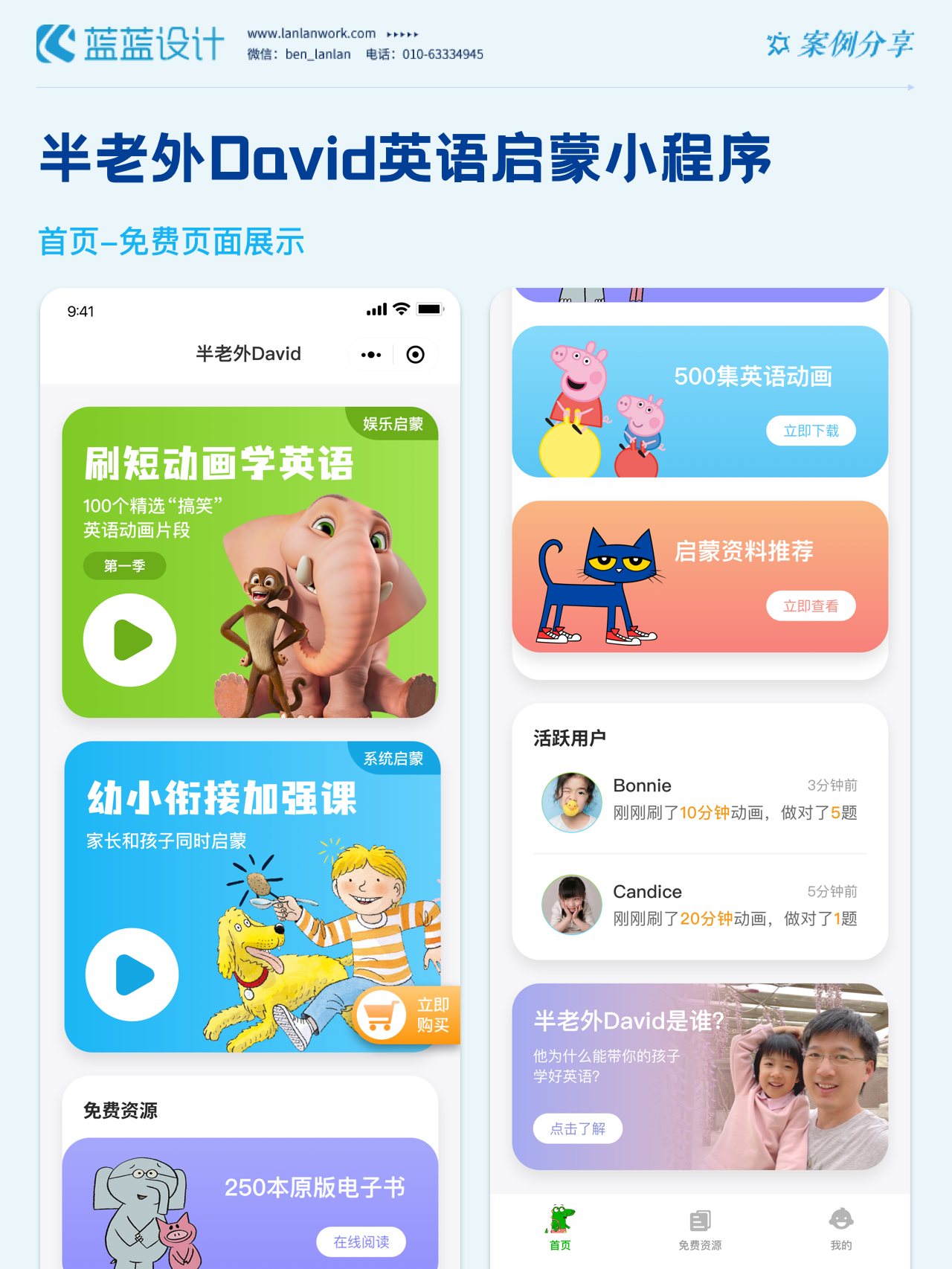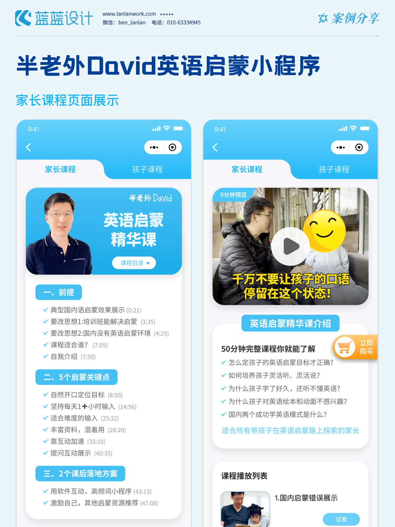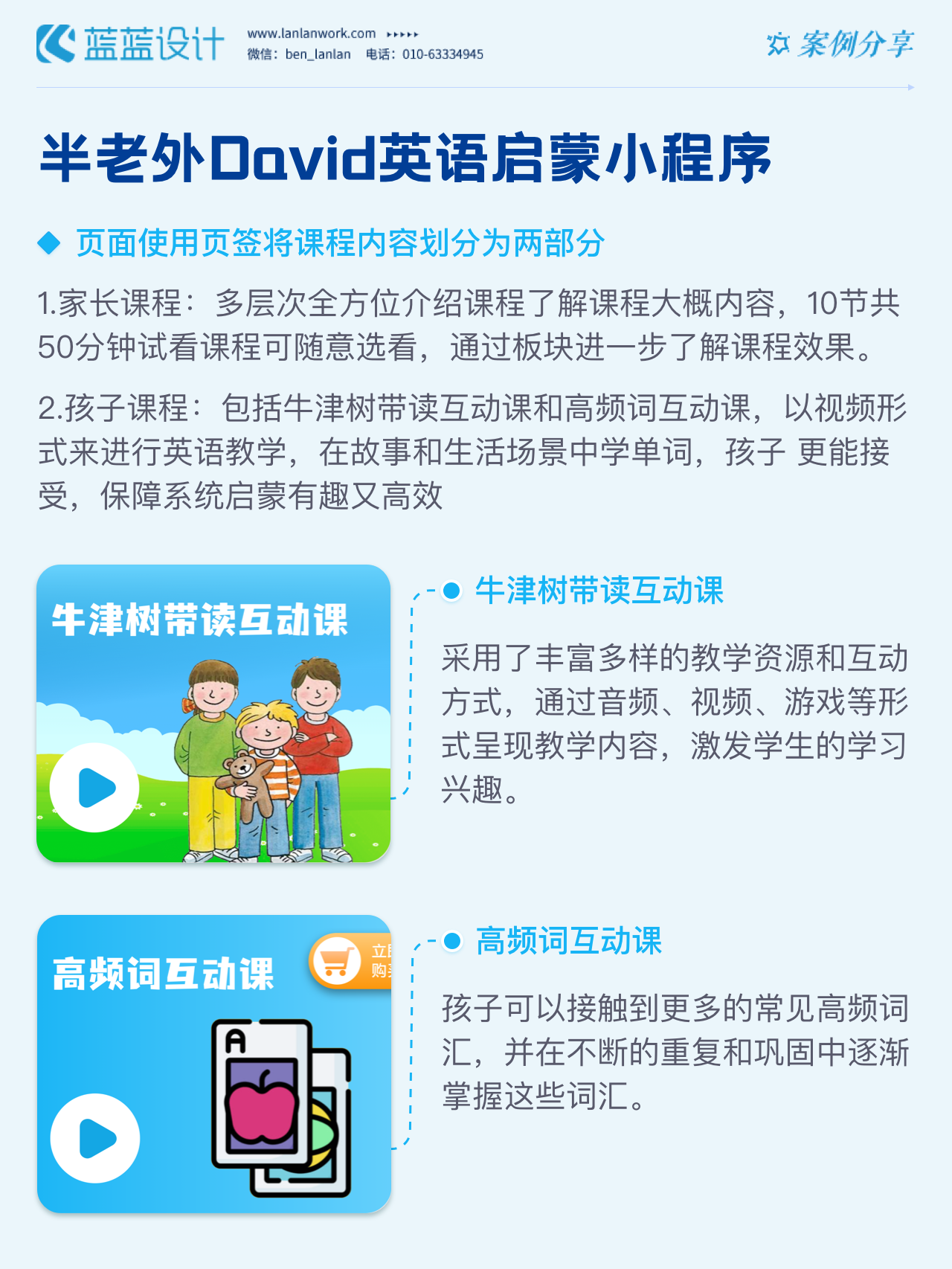 藍藍設計負責半老外David英語啟蒙小程序的界面整體風格和細節優化工作,也包括圖片優化等諸多視覺內容。前期雙方通過不斷溝通和深入了解最終確定了頁面的風格樣式。看視頻學英語的方式更容易為孩子所接受,頁面的簡潔風格和顏色應用更加吸引兒童。