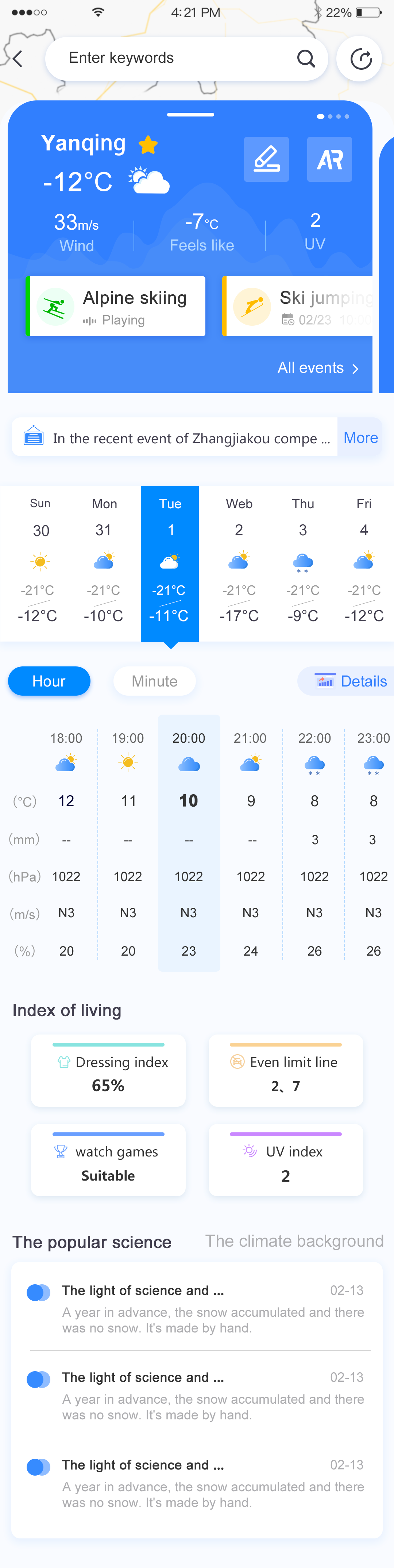 冬奧智慧氣象 APP 是專門面向國內外 IOC(國際奧委會)官員、冬奧會的組織與管理者、運動員與教練員以及關注冬奧會比賽進程的公眾用戶,通過該 APP 向國內、國外用戶提供權威、準確、及時的官方氣象服務信息,并作為冬奧會官方氣象服務網站的有力補充,通過智能手機向用戶提供優質的冬奧氣象服務。該 APP 以冬奧比賽場地的預報、實況和預警的氣象服務為設計重點,面向不同用戶的天氣需求進行定制化開發。開發原則上以服務用戶為主,創新設計服務流程和服務模式,讓國內外用戶能夠體驗到冬奧氣象服務的實用和貼心,并具有一定的科技感和獲得感。