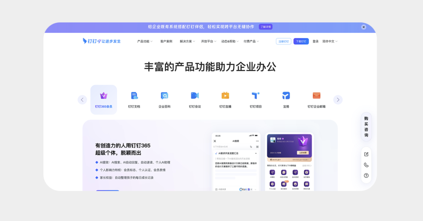 將圖標與文字上下排版,搭配圓角矩形背景標識選中狀態(tài),既能提升頁面豐富度,又能讓用戶快速識別功能。這種設(shè)計在工具類、辦公類產(chǎn)品中尤為適用,比如釘釘?shù)墓δ軜撕烅摚煤啙崍D標搭配 “釘釘文檔”“企業(yè)會議” 等文字,既清晰傳達功能,又讓界面更具設(shè)計感,降低用戶認知成本。