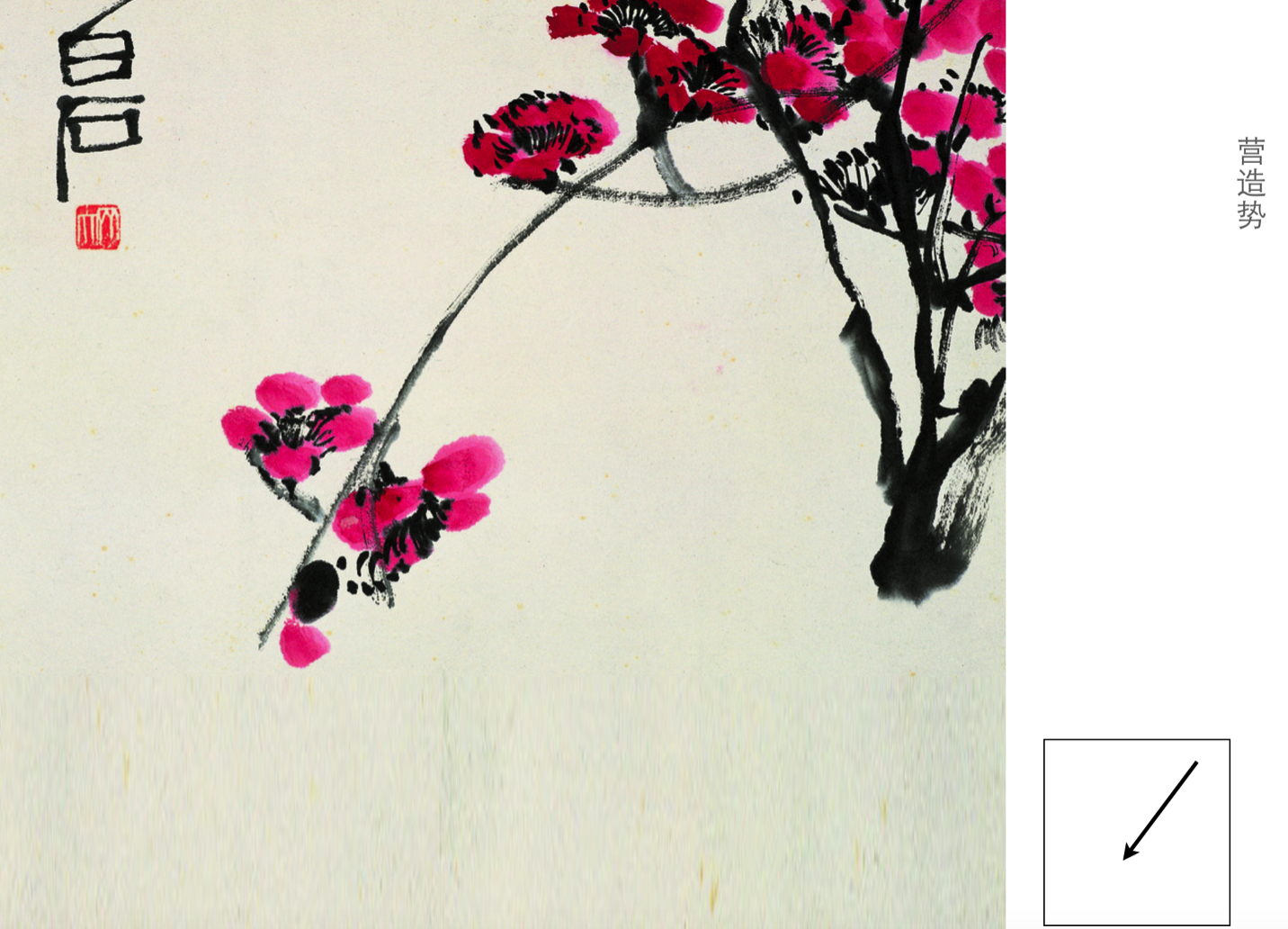 當(dāng)文字小而成行,視覺上就形成了“線”,而圖標(biāo)為“點(diǎn)”,人們的閱讀習(xí)慣使成行的文字具有向右擴(kuò)張的趨勢,這種趨勢同國畫的“勢”一樣的道理。