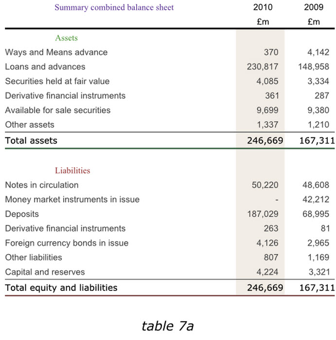 鑒于此,我們需要采用其他年報慣用的展示方式,以符合讀者的閱讀習慣,保證數據展示的清晰準確。請注意,下表中更清晰的那副,是基本上完全根據英格蘭銀行2010年年報格式制作,是清晰展示數據表格的優秀樣本。