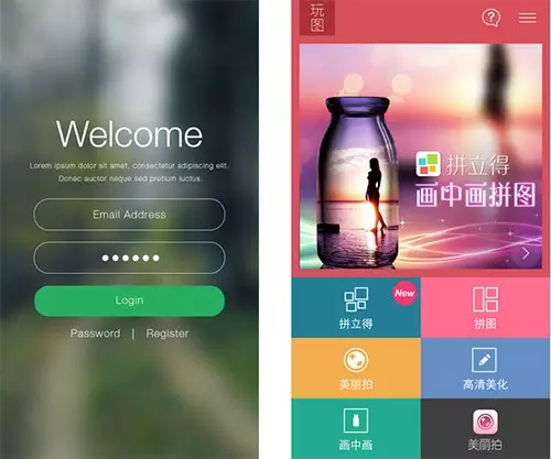 下面的左圖是一個注冊頁面,btn采用了中軸型的構(gòu)圖,清晰地展現(xiàn)了操作項和注冊流程。右圖采用了上下分割的版面構(gòu)成,上面為圖片展示,下面部分為選項和操作,結(jié)構(gòu)非常清晰。