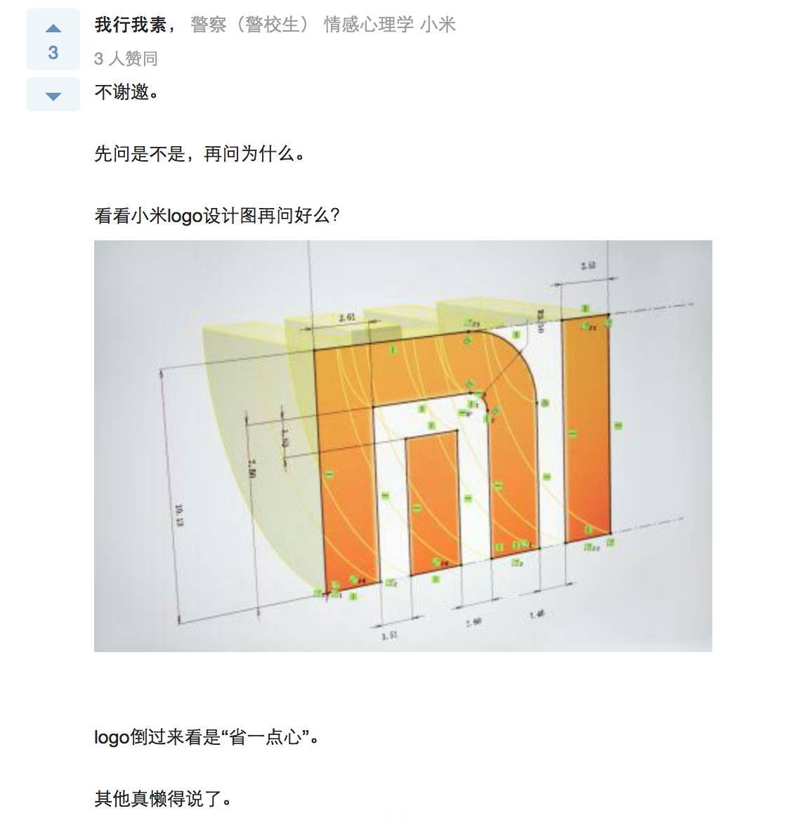 即便小米的LOGO當年剛發布的時候還是有抄襲或是撞車嫌疑,但從截圖回復來看,小米公司內部還是對這個LOGO認可, 但我不覺得在設計之初,設計師就知道他設計的LOGO倒過來還能扯上“心”這個層面的意思。
