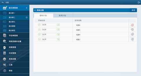 針對應(yīng)用場景和特殊場景,可以進行不同的預(yù)案,設(shè)定不同主題的屏幕內(nèi)容和屏幕切換顯示的時間。