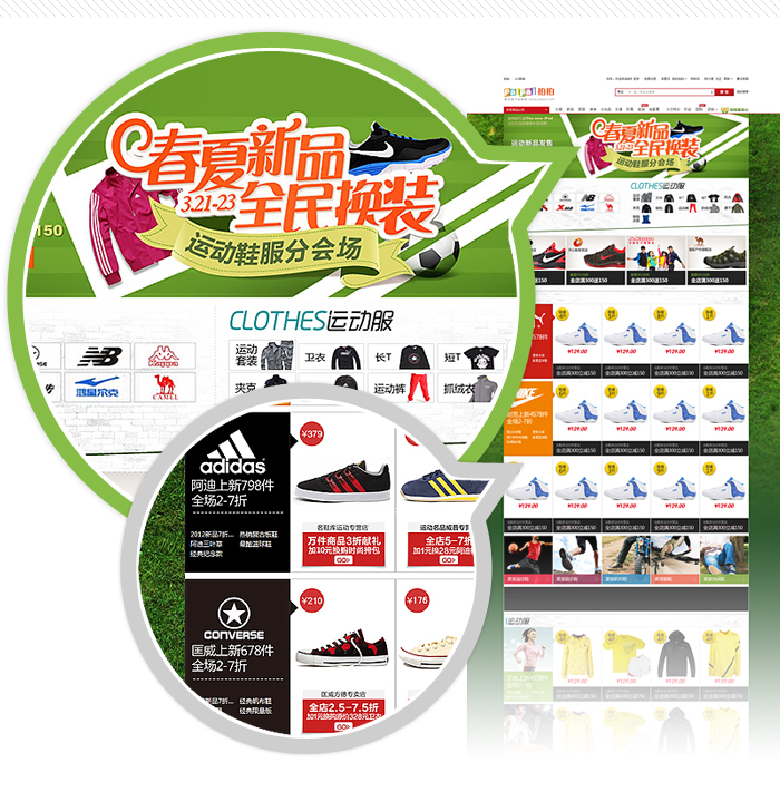 拍拍3月的大型促銷活動《春夏新品,全民換裝》,主會場設計上運用明快、鮮艷的春夏色彩塊組合,在細節上采用花朵草地藍天更加突顯初春購物的輕松氛圍。并在活動頭部主畫面中采用HTML5+CSS3實現的酷炫動畫,為用戶帶來了全新的頁面體驗。