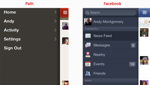 Path和Facebook的app界面,即使右側只顯示一小部分內容,而用戶卻能感知到后面更多的內容,并能將導航和內容輕易的聯系起來。