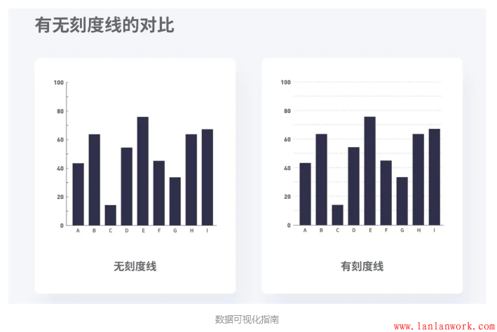 如果你的聽眾只需要了解A數(shù)據(jù)大于B數(shù)據(jù),那么刻度線是沒有必要的,只需在坐標軸上使用小刻度即可。如果你的讀者要花一些時間在柱狀圖上并感興趣A數(shù)據(jù)是45.65而B數(shù)據(jù)是37.66,那么使用刻度線將有助于他們理解。