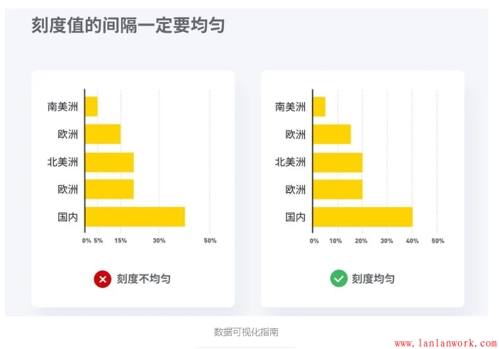 在坐標軸上應(yīng)該使用均勻的跨度0,5,10,15,20,而非不均勻的跨度0,3,5,16,50。這里即呼應(yīng)上方「坐標軸下限」中的最后一點,有時圖表制作人也會用不均勻的刻度來蒙騙我們對數(shù)據(jù)產(chǎn)生誤解。