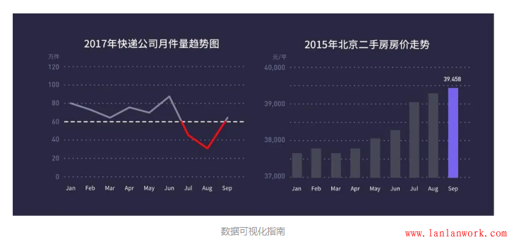 如上左圖,通過添加輔助線和標紅的方式,來顯示快遞公司未達到60萬件派件標準的月份,從而突出顯示公司業(yè)績不合格部分。如上右圖,通過對9月份的顏色區(qū)分,來突出顯示二手房價格在9月份達到前所未有的高度。
