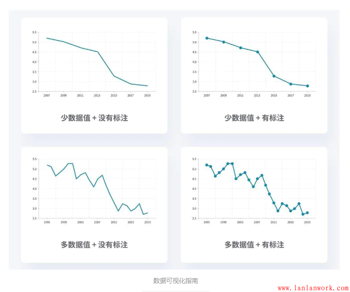 當有些特定的數(shù)值特別重要時,我們可以在線條上標注出他們,如果你有大量的數(shù)據(jù)需要展示,或者你只想展示數(shù)據(jù)的走勢,那么其實你只需要使用折線就足夠了,不需要增加數(shù)據(jù)點。不信你可以試試,大量的數(shù)據(jù)點 = 混亂不堪的界面。