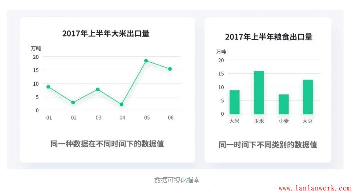 2017年1月和2月的大米出口量是相關(guān)的,他們代表一種數(shù)據(jù)在不同時間下的數(shù)據(jù)值,因此我們可以用折線圖將它們連接起來。但是2017年1月的大米出口量和玉米出口量(16萬噸)是不相關(guān)的,所以我們不能隨便用折線圖來代替柱狀圖。