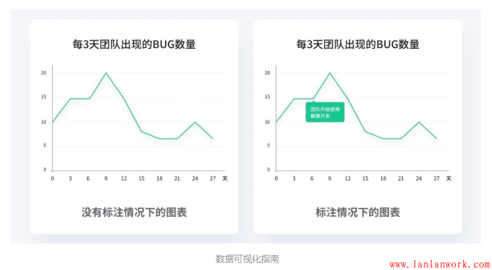 如果我告訴你,這個圖表想告訴我們,在第6天的時候該團隊使用了敏捷開發(fā),在使用新技術(shù)初期,Bug數(shù)量明顯上升,而后瞬間下降。加上了標注,圖表講述了一個跟之前完全不一樣的故事。