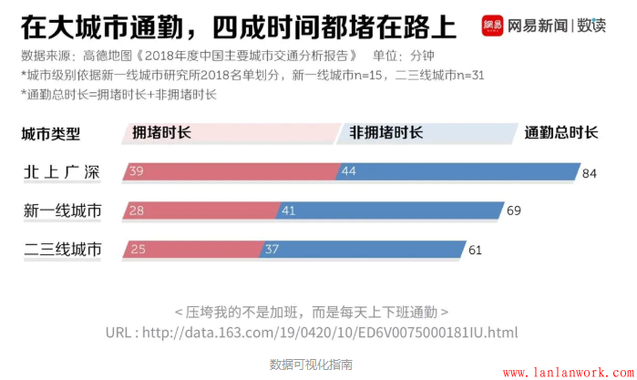 下圖是大城市通勤的時長統(tǒng)計,通過這些柱狀圖,我們能很清晰的看出各個級別的城市通勤時長的比例關(guān)系,并了解他們的擁堵時長和非擁堵時長分別是怎樣的情況。