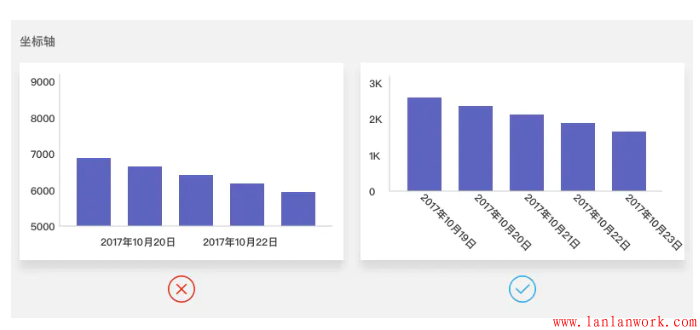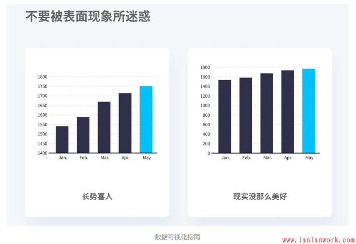 這也同時提醒我們要注意,在觀看別人的圖表時,僅僅觀看柱狀圖的高低趨勢往往不能得出正確結(jié)論,需要注意坐標軸起始位置有沒有被人做過虛假處理。