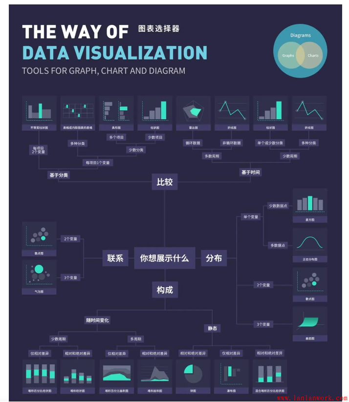 Andrew Abela 根據(jù)統(tǒng)計圖的主要功能,將所有的統(tǒng)計圖分為了四大類:比較、聯(lián)系、分布、構(gòu)成。在其資料的基礎(chǔ)上,我制作了一套更適合設(shè)計師的「圖表選擇器」(The Way of Data Visualization)。