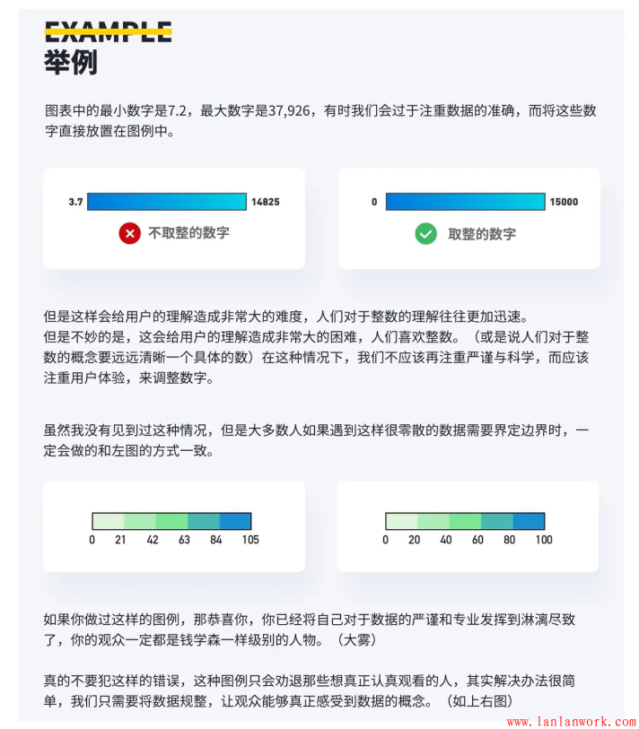 有時我們甚至可以更簡約的表示圖例,當你只想表達一個漸進的過程,24和55之間的差異并不重要,觀眾只需要知道后者比前者大即可。在這種情況下,我們可以嘗試只標記出圖例的最大值和最小值,而不必要標記出每個邊界或者顏色,這樣可以給觀眾減少不必要的信息負擔(dān)。