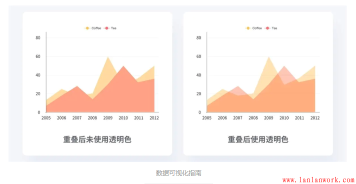 當圖表中要展示多組數(shù)據(jù)時,最好保證所有的數(shù)據(jù)都不重疊,這樣才可以更好的展示數(shù)據(jù)。如果無法避免重疊,則應(yīng)該適當?shù)脑O(shè)置顏色和透明度,使得重疊的區(qū)域變得更加易讀。