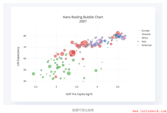 當包含多重變量時,散點圖本身包含2個維度的數(shù)據(jù),當出現(xiàn)更多維度時,我們可以通過改變散點的顏色和大小甚至是形狀來對數(shù)據(jù)進行更多維度的劃分,這個時候,散點圖即變成了氣泡圖。