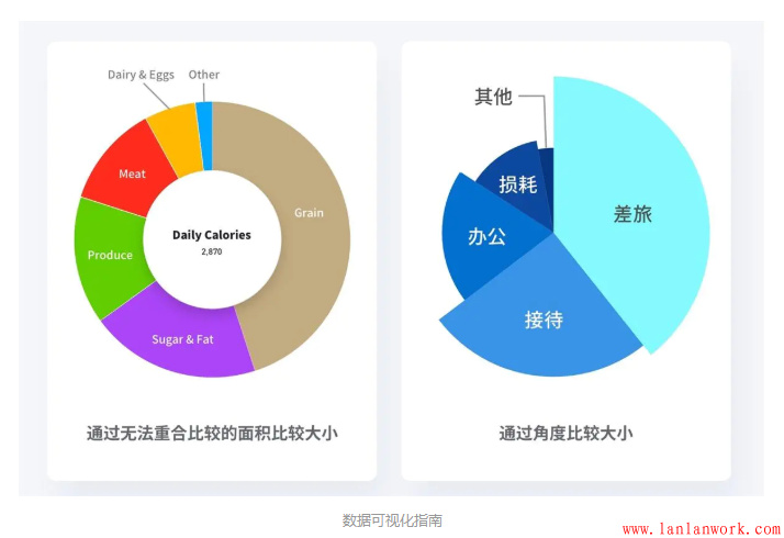 例如上面左圖,我們很難去比較每日從肉類(Meat)中攝入的卡路里與從糖類(Sugar&Fat)中攝入的卡路里數(shù)量的比例。人眼的直覺中,糖類與肉類的比例應(yīng)該在2:1左右,但實際的比例卻是1.5:1。