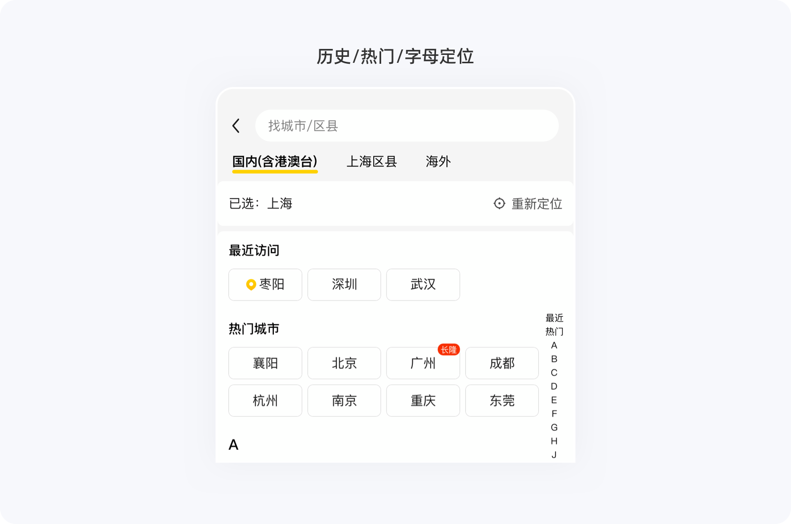 另外,我們在選擇地址時,如果將所有城市一股腦平鋪在界面上,用戶想要選擇自身所需,則需要花費大量的時間。對城市進行了分類分層,以及有了搜索歷史、熱門城市以及右側的首字母索引后,用戶就能通過不同維度快速找到想找的城市,選擇效率直線上升。