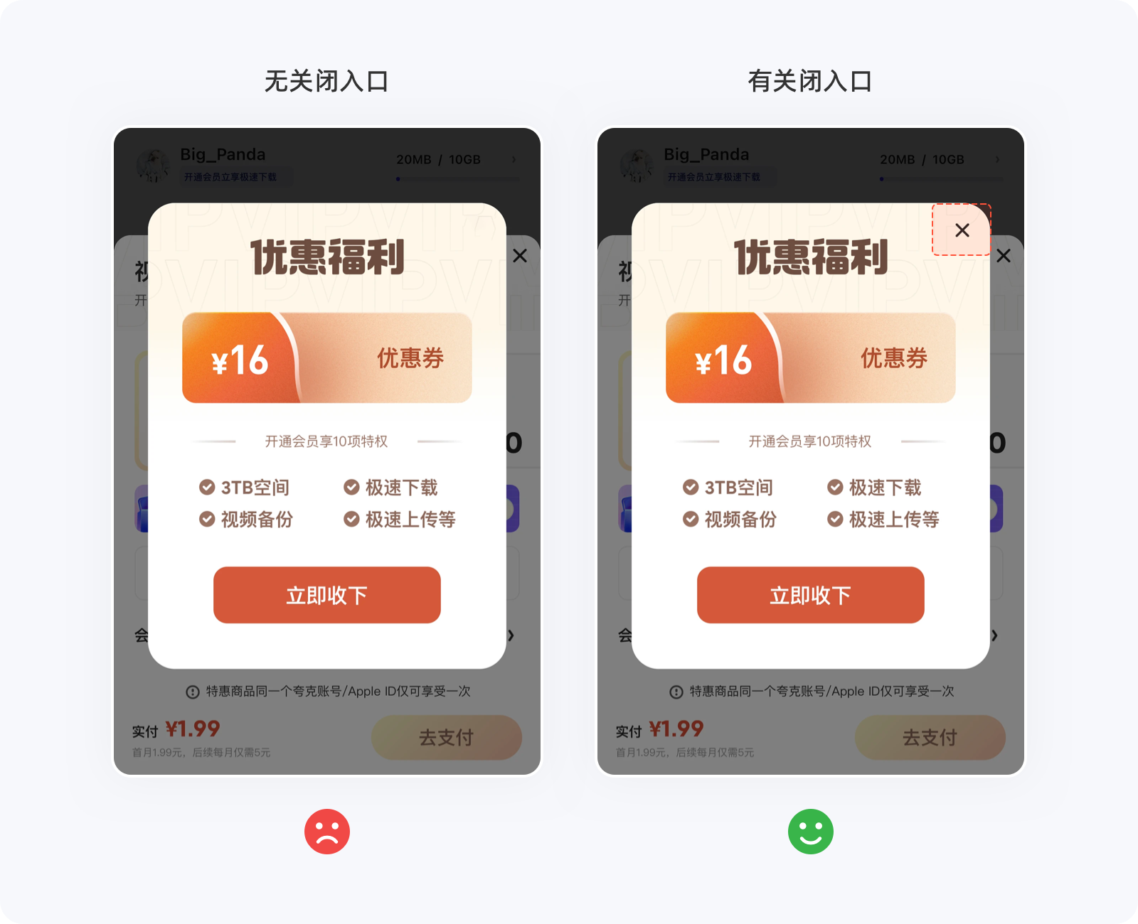 希克定律要做的是通過減少用戶做決定的時間,來提升轉化率以及用戶體驗,但不管在什么情況下,用戶都希望自己還擁有選擇的權利,如果設計師自作聰明的將選項減到只剩一個,就相當于告知用戶必須接受,那么用戶就有種被強制、綁架的感覺,只會存在兩個結果:①被你的產品拿捏、②離開你的產品,筆者相信第一種可能性的概率極低,畢竟同類型的產品并不是只有你一家(壟斷除外)。如下圖的彈窗,用戶即便不愿意進入任務流程,可別無選擇,只能進入后再返回才能回到原位,這種做法無端增加用戶的操作成本,極易引起反感情緒。不管產品如何希望用戶轉化,切不可強制他們接受,需要給用戶留一條返回的“路”,即便不那么起眼,至少還有選擇的權利。