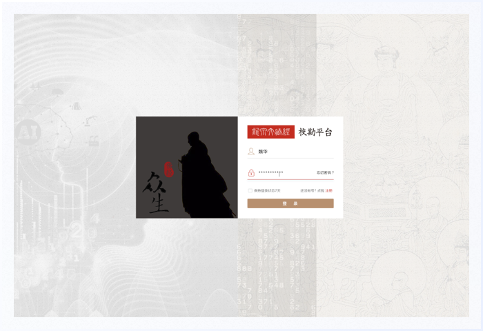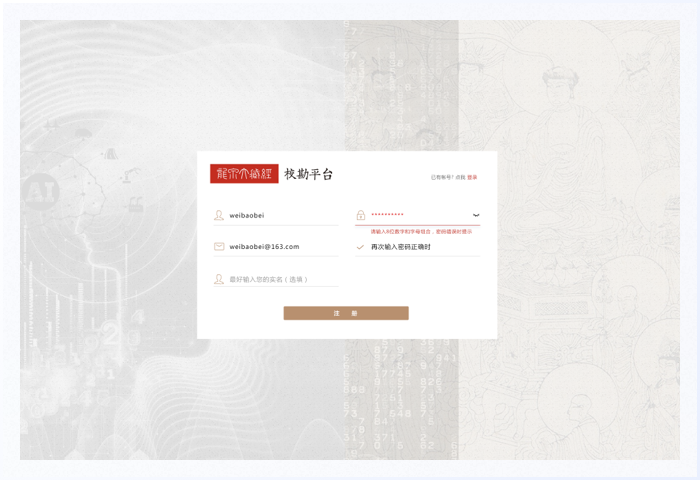 注冊(cè)頁(yè)是登錄頁(yè)的延伸頁(yè)面,可以與登錄頁(yè)互相切換。使用古典藏經(jīng)圖案作為背景,上面疊加內(nèi)容卡片且居中分布,在整體視覺(jué)上符合產(chǎn)品調(diào)性,在操作上完善各種輸入狀態(tài)的反饋。