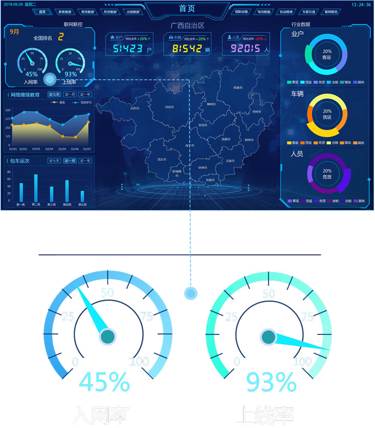 儀表盤:入網率和上線率用儀表盤的形式來展示,整體增加了整個頁面的科技感。兩個儀表盤 分別采用藍、青兩種比較亮的顏色同是也有輕微的漸變。儀表盤沒有全部封閉,下邊由數字顯示當 前具體的百分比。